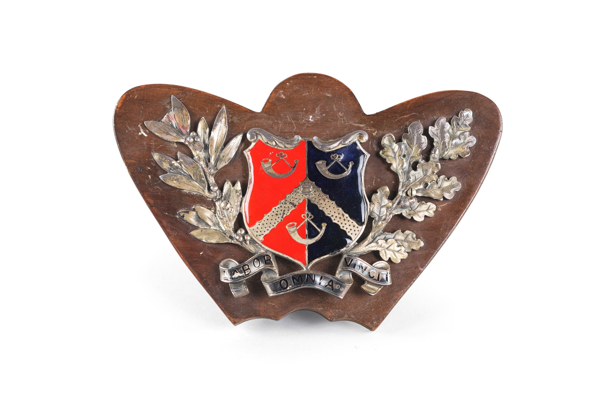 Crest in argento, Inghilterra XIX Secolo, Regina Vittoria - con scudo decorato a smalto affiancato da ramo di ulivo e di quercia; alla base un cartiglio con iscrizione latina "Labor Omnia Vincit". Supporto in legno. - cm 12x19x4