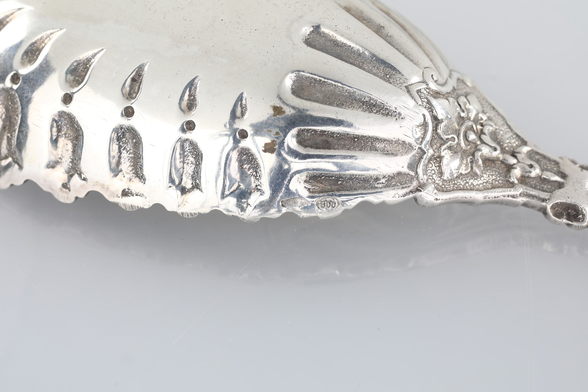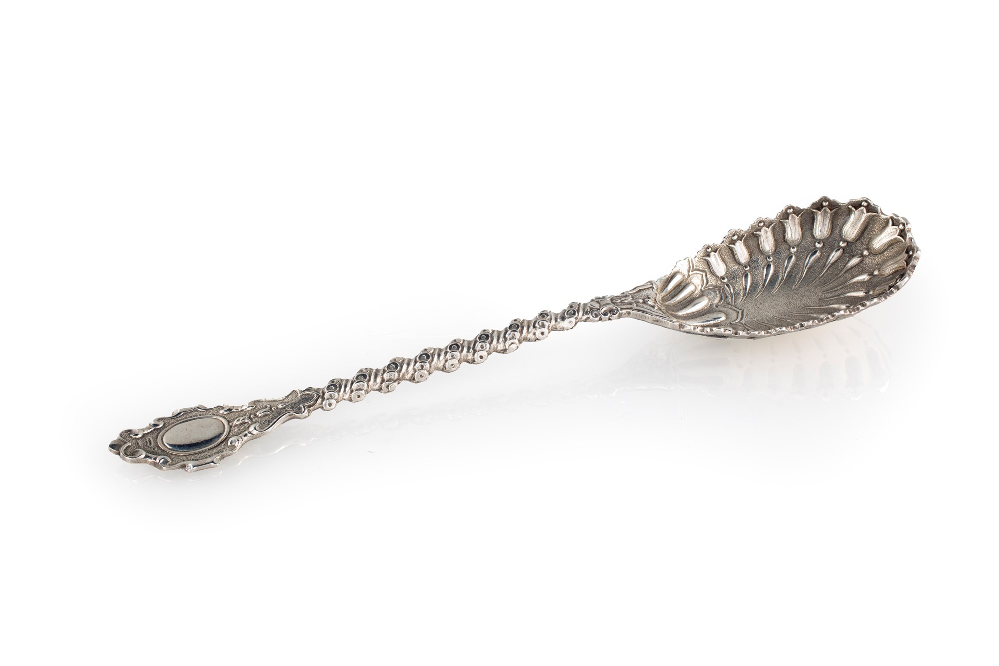 Cucchiaio da cerimonia in argento, Milano, anni Cinquanta, argentiere Messulam - con tulipani stilizzati disposti a raggiera nella parte concava; manico tortile sormontato da un cartiglio. - cm 25,5 - gr.136