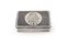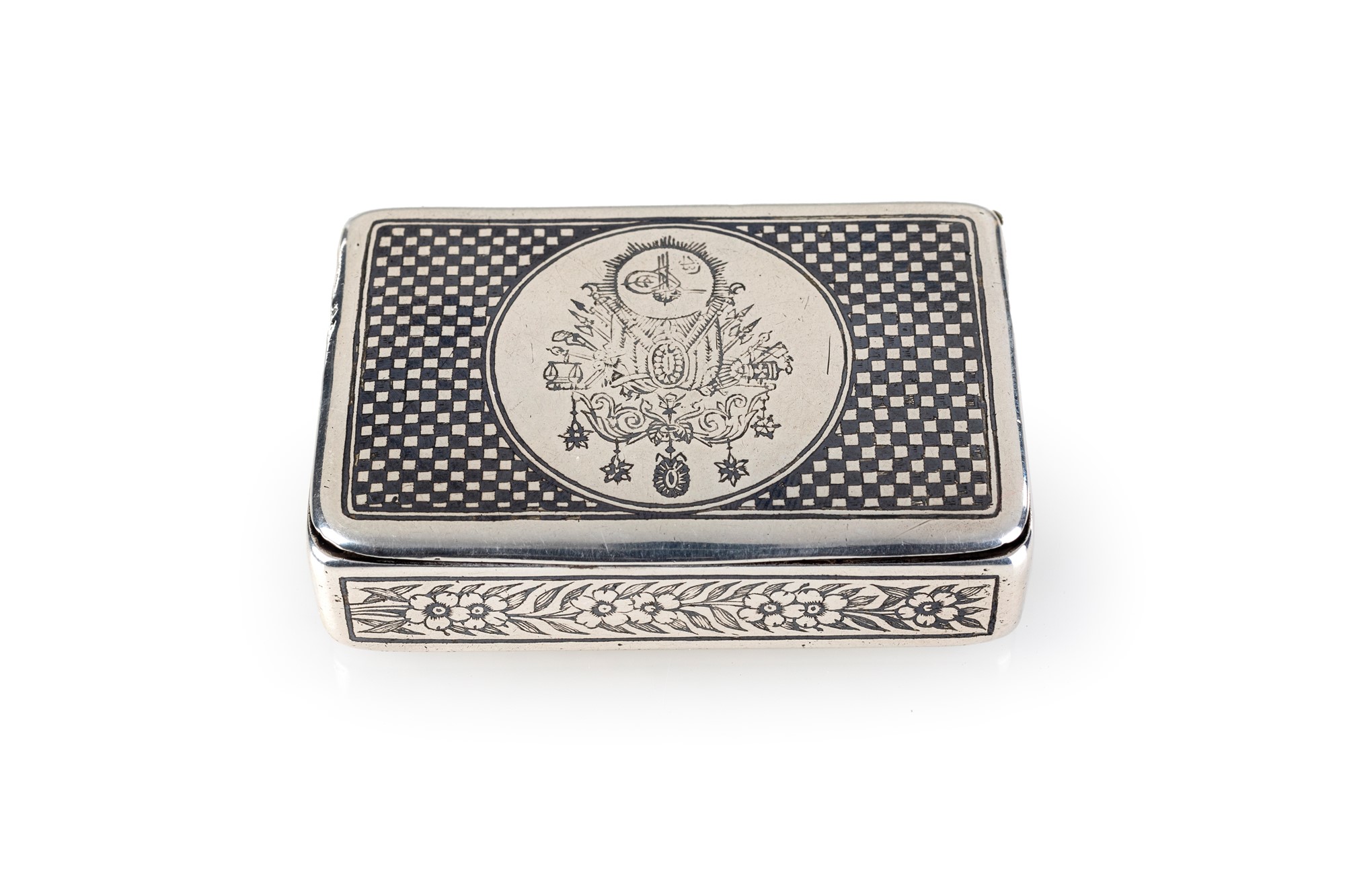 Tabacchiera in argento niellato, probabilmente Russia, 1878 - di forma rettangolare con fitta decorazione niellata in nero; al centro del coperchio stemma araldico inciso. - cm 1,3x5,7x3,7 - gr. 68