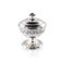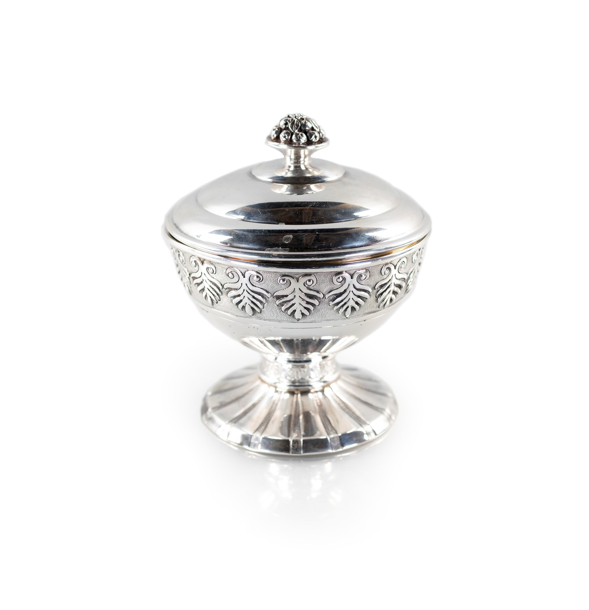 Coppa in argento con coperchio - caratterizzata da un'ampia fascia percorsa da palmette in sequenza; interno in vermeille, piede circolare sottolineato da fasce piatte, coperchio con presa in forma di alzata ricolma di frutta. - cm 13,5x11,5 - gr. 366