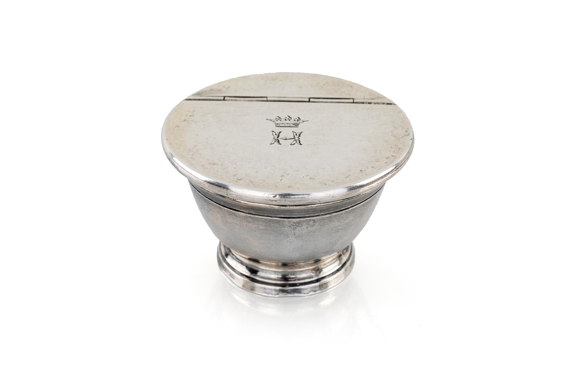 Portapillole in argento 925/1000, Francia, ultimo quarto del XIX secolo, argentiere André Aucoc - a forma di coppa circolare con coperchio parzialmente apribile tramite cerniera decorato da lettera H sormontata da corona incise. - cm 3x4,5 - gr. 64