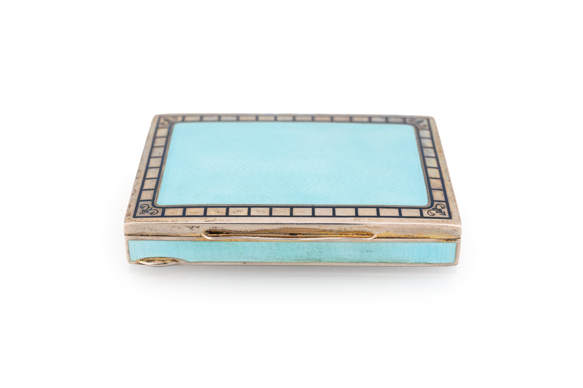 Tabacchiera in argento e smalto celeste su fondo guilloché, Italia, inizio XX secolo, argentiere O.C. - di forma rettangolare reca bordura a riquadri in smalto blu con motivi angolari a punta di freccia. - cm 1,3x8x5,5 - gr. 90