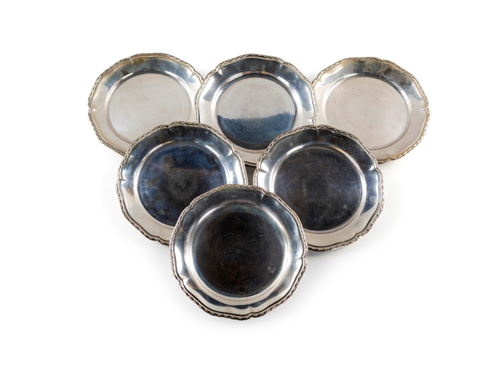 Sei piatti da frutta in argento - con profilo sagomato percorso da foglie. Segni d'uso. - diametro cm 22 - gr. 1682