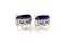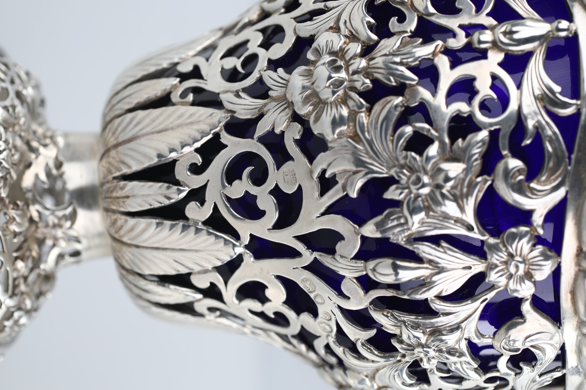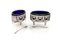 Coppia di saliere in argento, fine XIX/inizio XX secolo - di forma ovale con vaschetta in vetro blu trattenuta da festoni e nastri sorretti da fiocchi entro profili perlinati; ai lati teste di Medusa minuziosamente rese; piedi a pilastro; complete di cucchiaino. - cm 5,5x8,5x5,5 - gr. 198