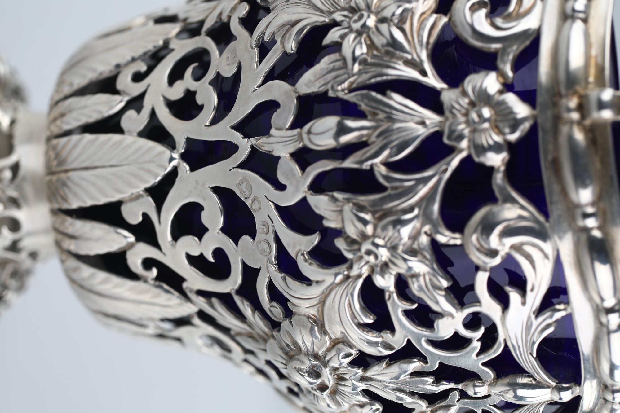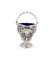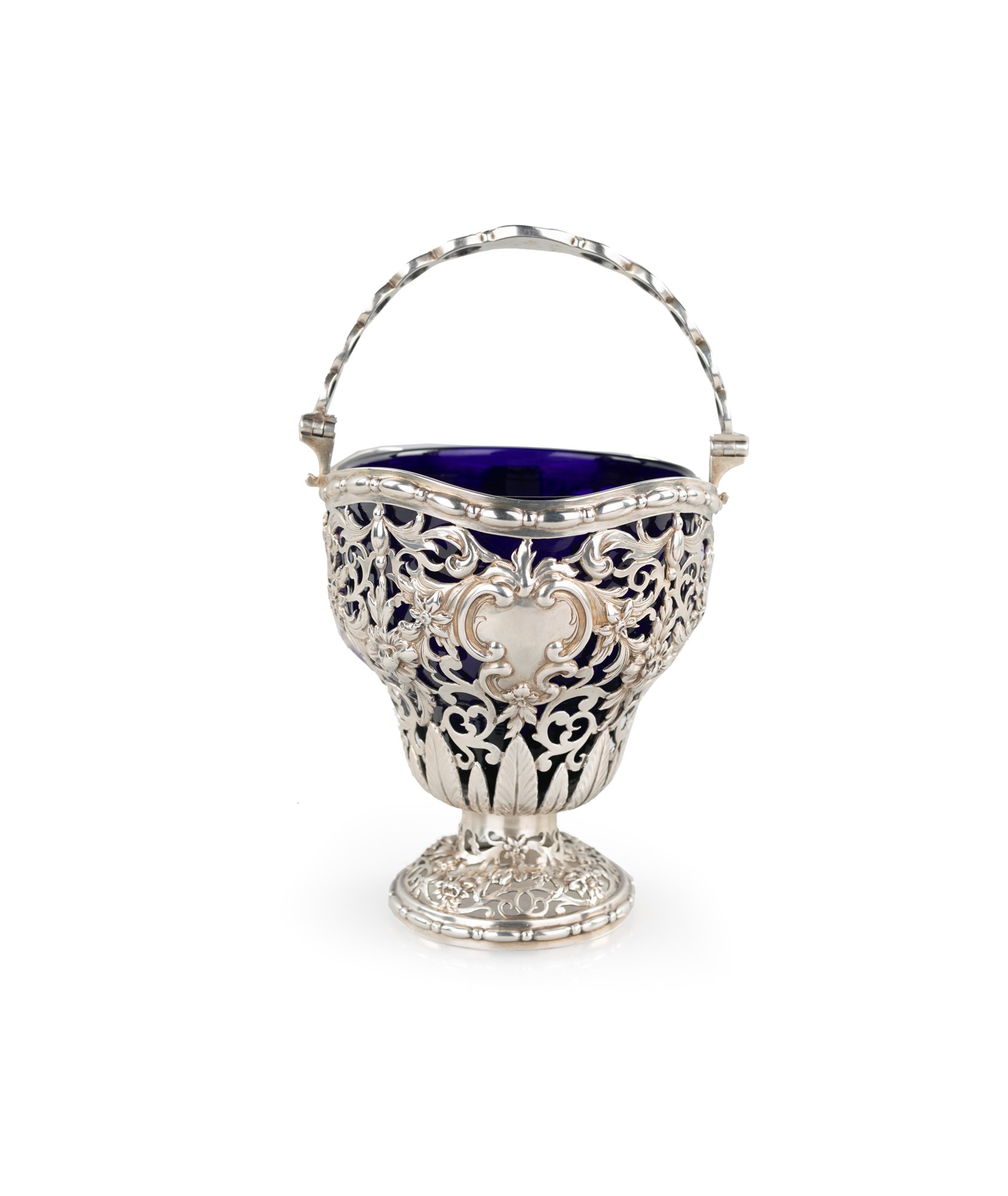 Cestino in argento 925/1000, Londra 1858, argentieri Charles Thomas Fox & George Fox - con vaschetta in vetro blu trattenuta da un fitto intreccio traforato a volute, motivi vegetali e fiori cesellati e sbalzati; piede circolare. - cm 13,2x11,7 - gr. 334