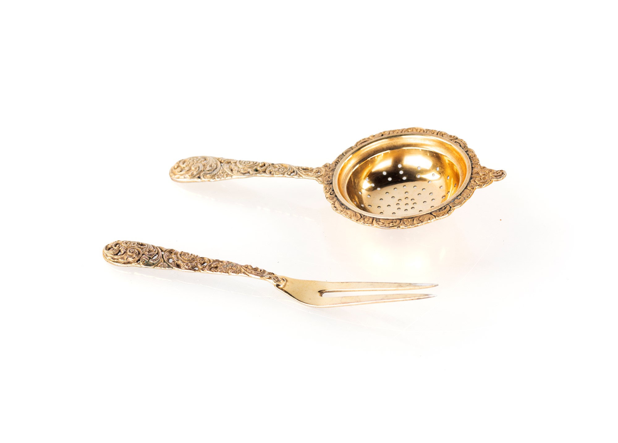 Colino da tè e forchettina per limone in argento dorato, argentiere Faccioli, Milano, Anni Cinquanta - con impugnature caratterizzate da volute, motivi vegetali e fiori. - cm 13,5 e cm 10,5 - peso complessivo gr. 47