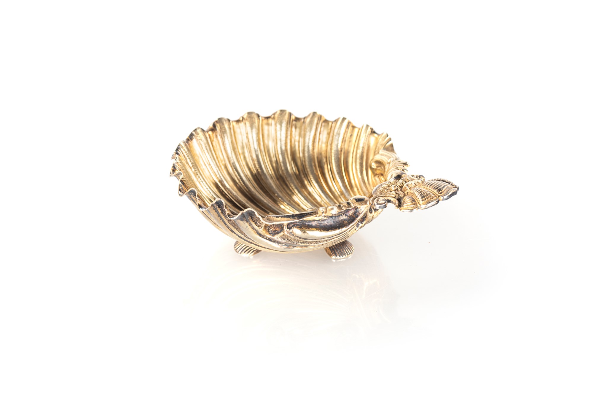 Coppetta porta bon-bon in argento dorato a miglior titolo (925/1000), Roma, Anni Quaranta - a forma di conchiglia, elemento distintivo ripreso per i tre piedi e come presa arricchita da volute e motivi geometrici. - cm 5,5x14x11 - gr. 240
