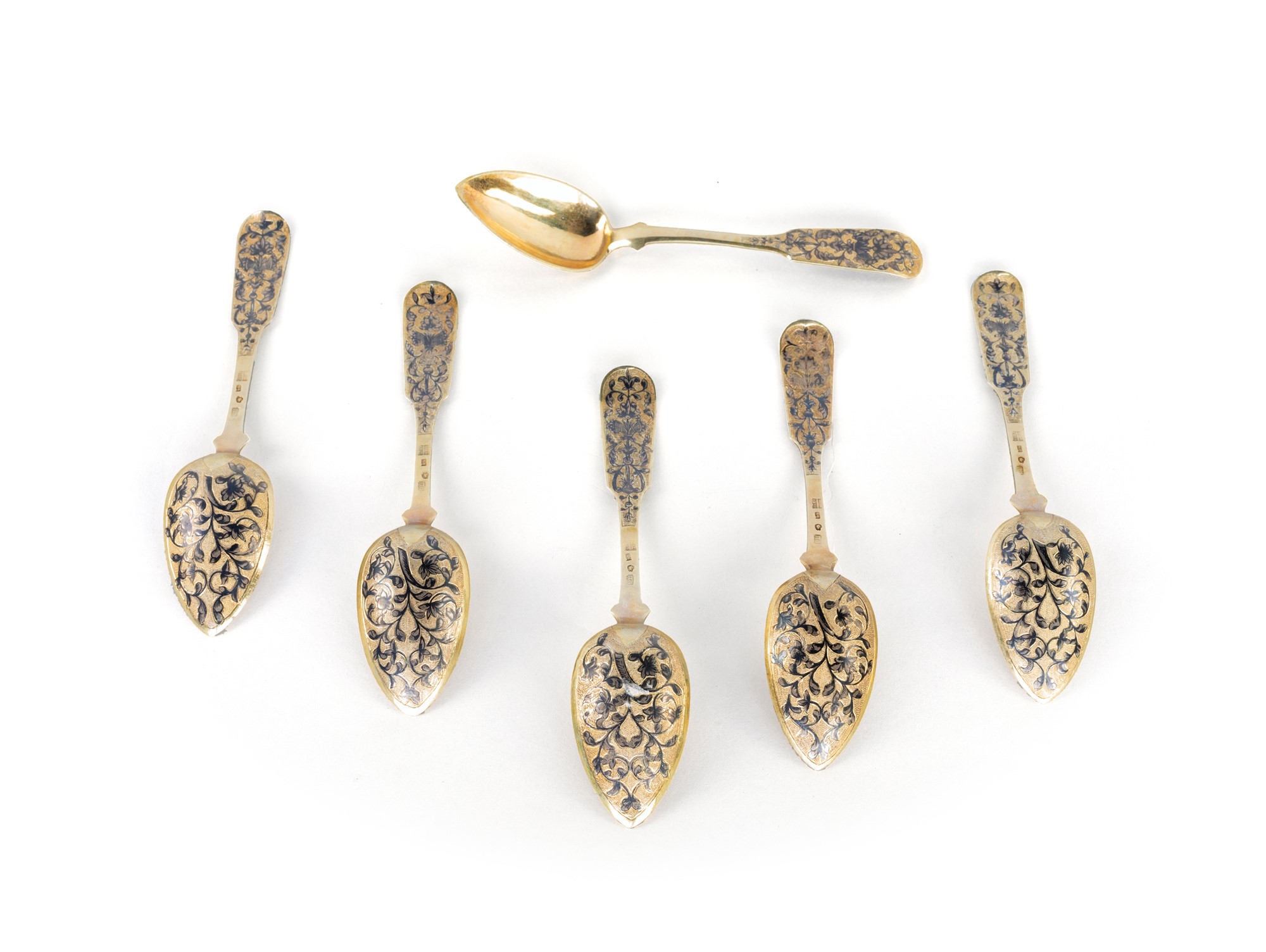 Sei cucchiai da dessert in argento dorato, Mosca 1820, argentiere Pavel Sazikov - con fitta decorazione niellata a volute e motivi floreali. - cm 17x3,5 - gr.226