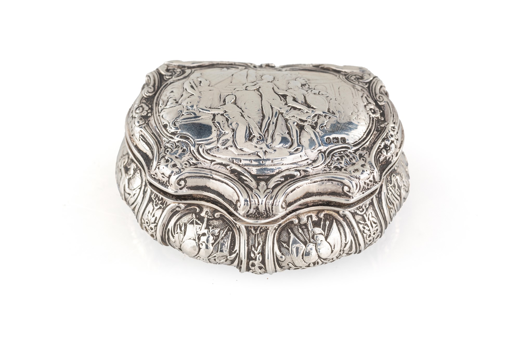 Scatola in argento 925/1000, Londra 1898, argentiere John George Smith - di forma sagomata con interno dorato, è decorata sul coperchio da una scena mitologica racchiusa entro volute vegetali; il corpo è scandito da panoplie d'armi cesellate alternate a cascatelle naturalistiche. - cm 3x8,5x6,5 - gr. 108