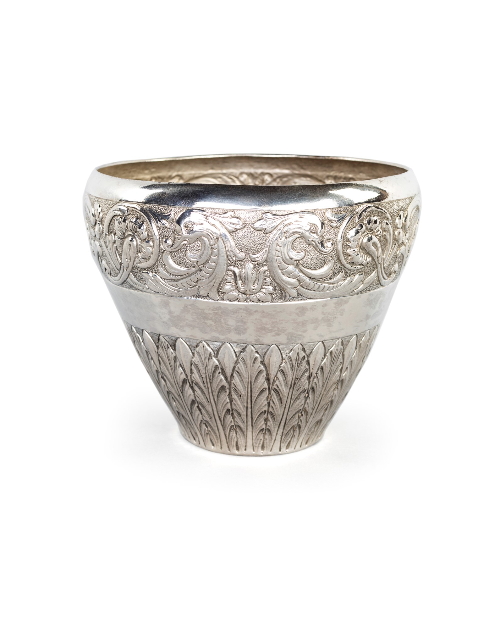 Secchiello in argento, Stato Pontificio, inizio del XIX secolo - di forma conica con bordo incurvato verso l'interno, decorato da una bordura a girali fogliacee che si dipartono da due figure di delfino affrontate; una fascia liscia delimita la parte inferiore idealmente calzata da un cespo di lunghe foglie lanceolate. - cm 15x16,5 - gr. 740