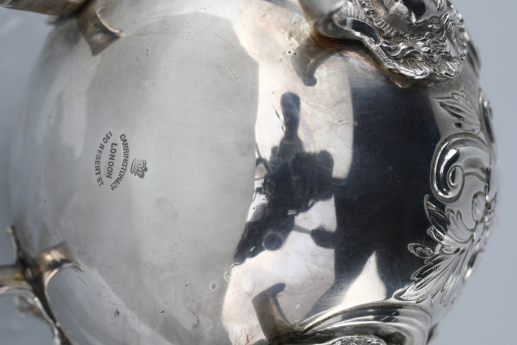 Caffettiera in argento, Londra 1893, argentiere Carrington & C. - interamente decorata a volute e fiori incisi e sbalzati; sorretta da quattro piedini con volti muliebri, reca coperchio incernierato sormontato da un pinnacolo, versatoio sagomato, manico in legno ebanizzato con attacco superiore in forma di mascherone. - altezza cm 19 - gr. 482