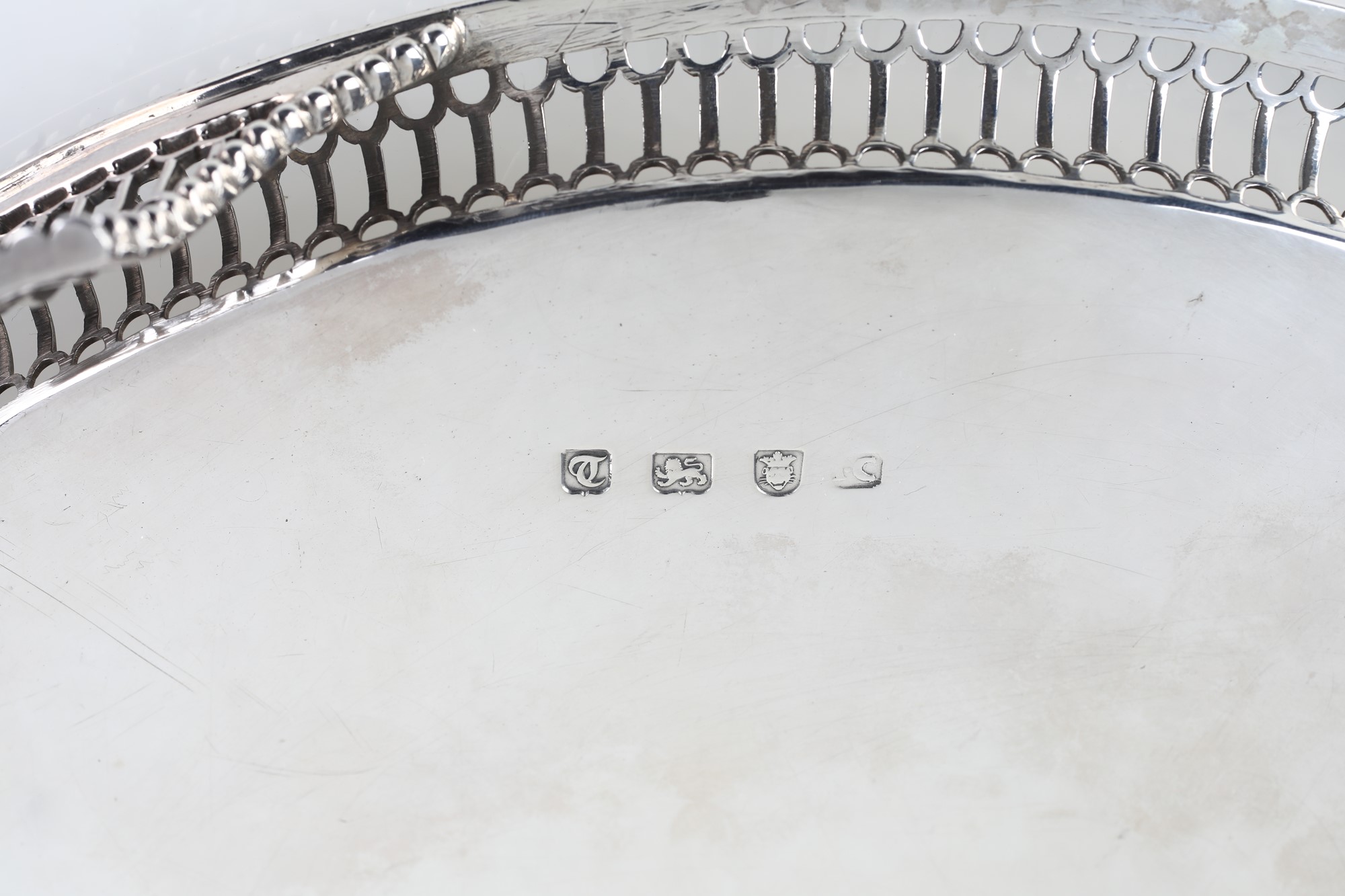 Salver in argento 925/1000, Londra 1774, argentiere John Cox (attivo dal 1766 al 1784) - con piatto circolare liscio ornato da un'ampia bordura a volute vegetali incise; piedi a mensola e ringhiera traforata con profilo perlinato. - cm 4x33 - gr. 1038