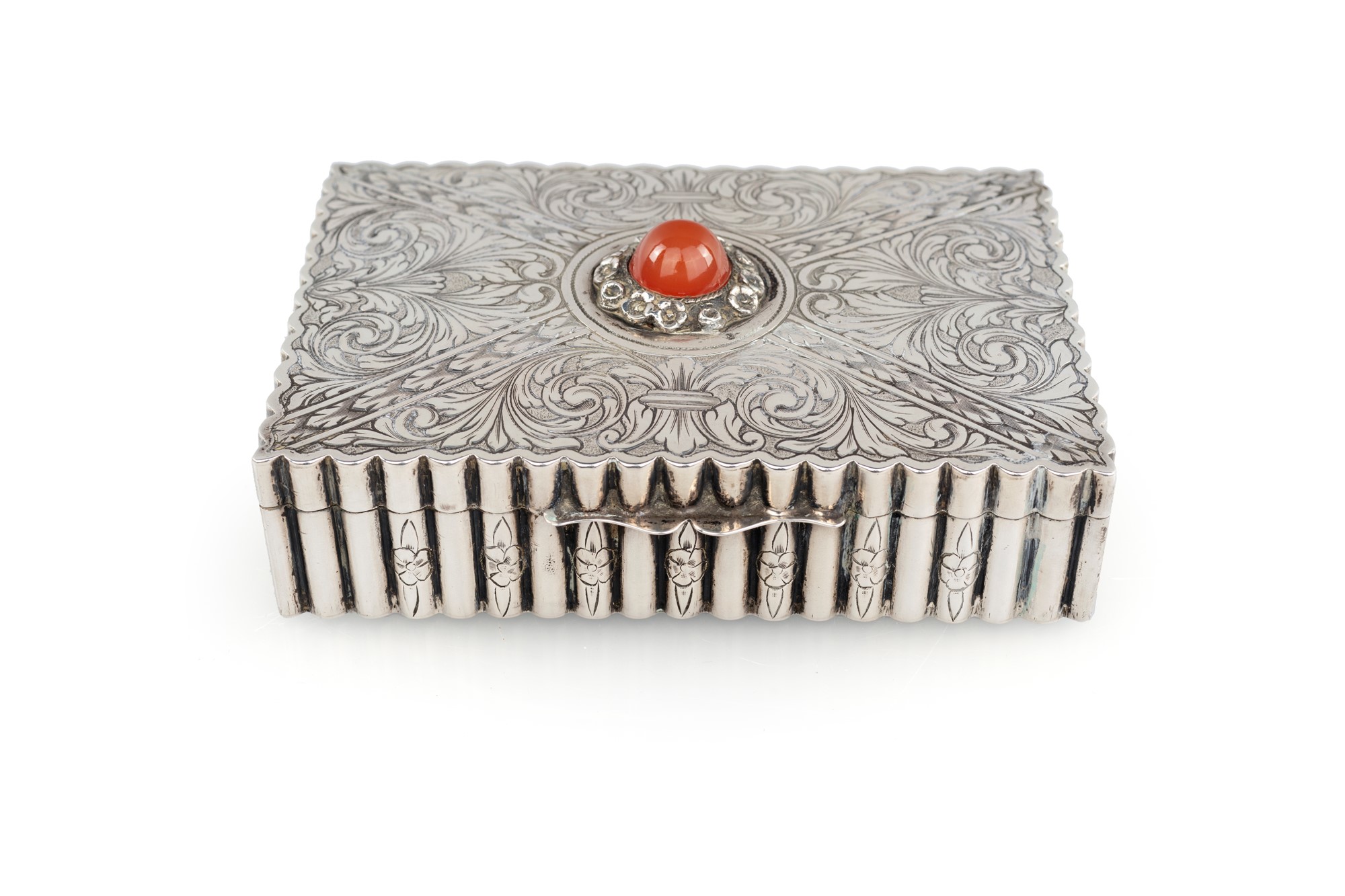 Scatola in argento, Milano, periodo Liberty, argentiere Miracoli - di forma rettangolare con coperchio incernierato interamente decorato da volute vegetali incise, dominato da una piccola ghirlanda di corolle cesellate a racchiudere una corniola cabochon; fascia percorsa da nervature; interno dorato. - cm 3x12x8 - gr. 255