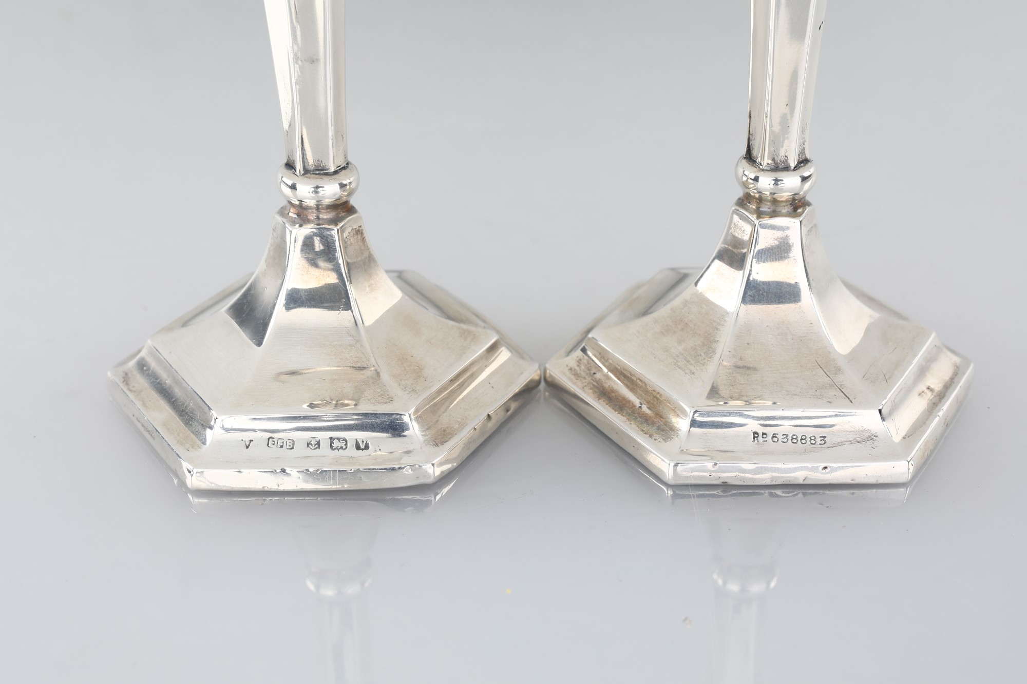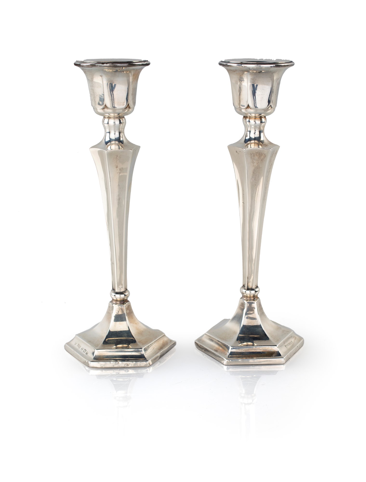 Coppia di piccoli candelieri in argento 925/1000, Birmingham 1920 ca., argentiere E.F.B. - con piede esagonale e stelo similmente poliedrico. - altezza cm 16,5 - peso lordo gr. 278