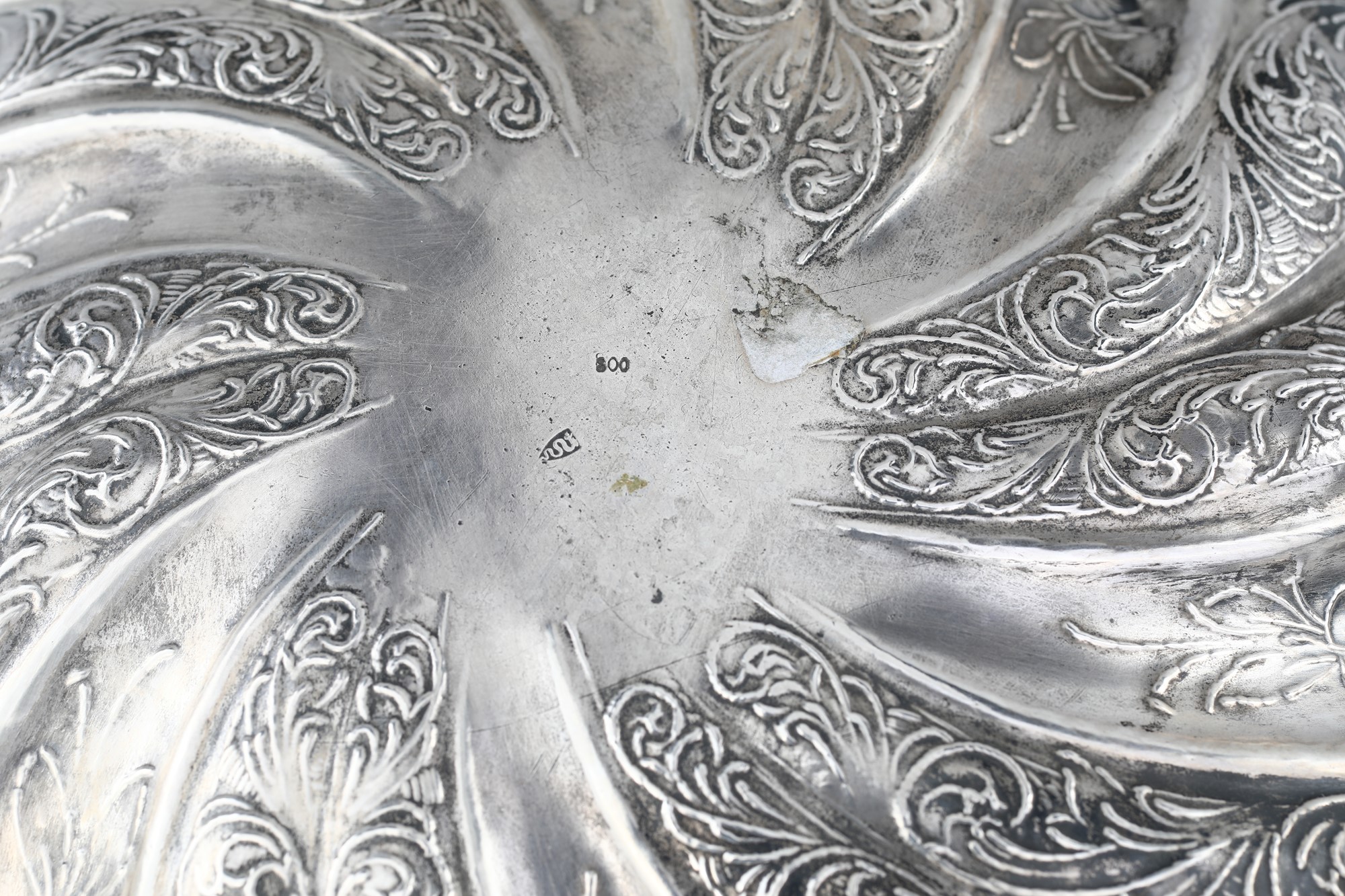 Centrotavola in argento, Milano, fine XIX/inizio XX secolo, argentiere Miracoli - di forma circolare con cavetto liscio da cui si diramano nervature elicoidali ad includere motivi naturalistici incisi; volute sbalzate intercalate a foglie racchiudono la decorazione; perimetro incorniciato da unghiature. - cm 6x31 - gr. 586