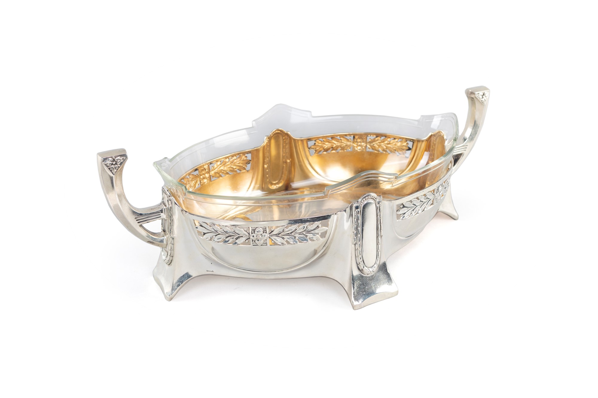 Centrotavola in argento e cristallo, Germania, inizio XX secolo - di forma ovale con struttura di gusto Liberty; manici ad arco di forma squadrata, interno dorato con coppa originale in cristallo. - cm 16x45x21 - gr. 558