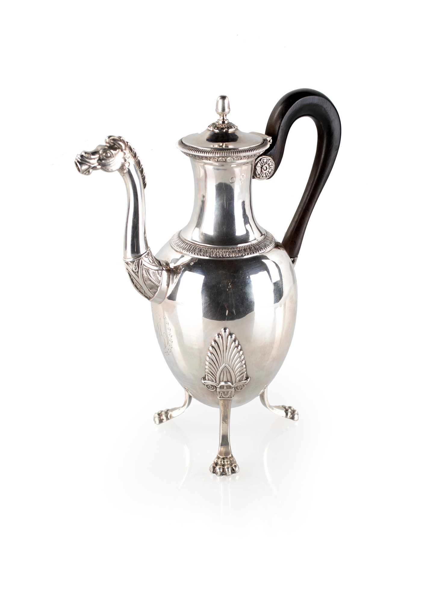 Caffettiera in argento, Parigi 1820 - con corpo a uovo sorretto da tre piedi incurvati terminanti a zampa ferina, decorati all'attaccatura da palmetta di gusto Impero; versatoio sagomato con estremità in forma di testa equina, coperchio incernierato con presa a birillo, manico sagomato in legno ebanizzato. - altezza cm 21 - peso lordo gr. 368