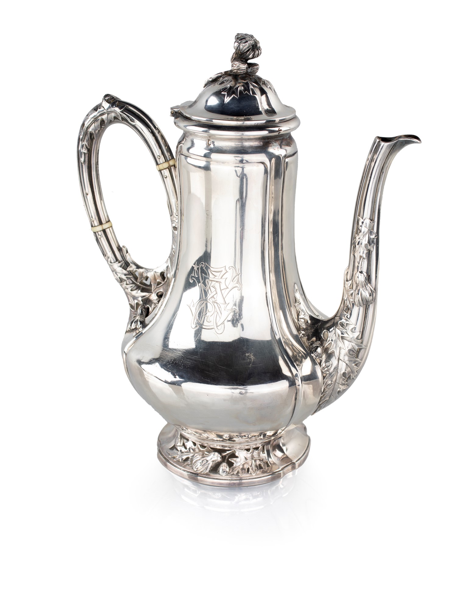 Caffettiera in argento 950/1000, Francia, ultimo quarto XIX secolo - caratterizzata da foglie cesellate disposte all'attaccatura delle varie partizioni; stesso elemento decorativo ripreso a traforo lungo il piede circolare; manico ovale, coperchio a cupolino sormontato da un fiore; monogramma inciso. - altezza cm 24 - gr. 670
