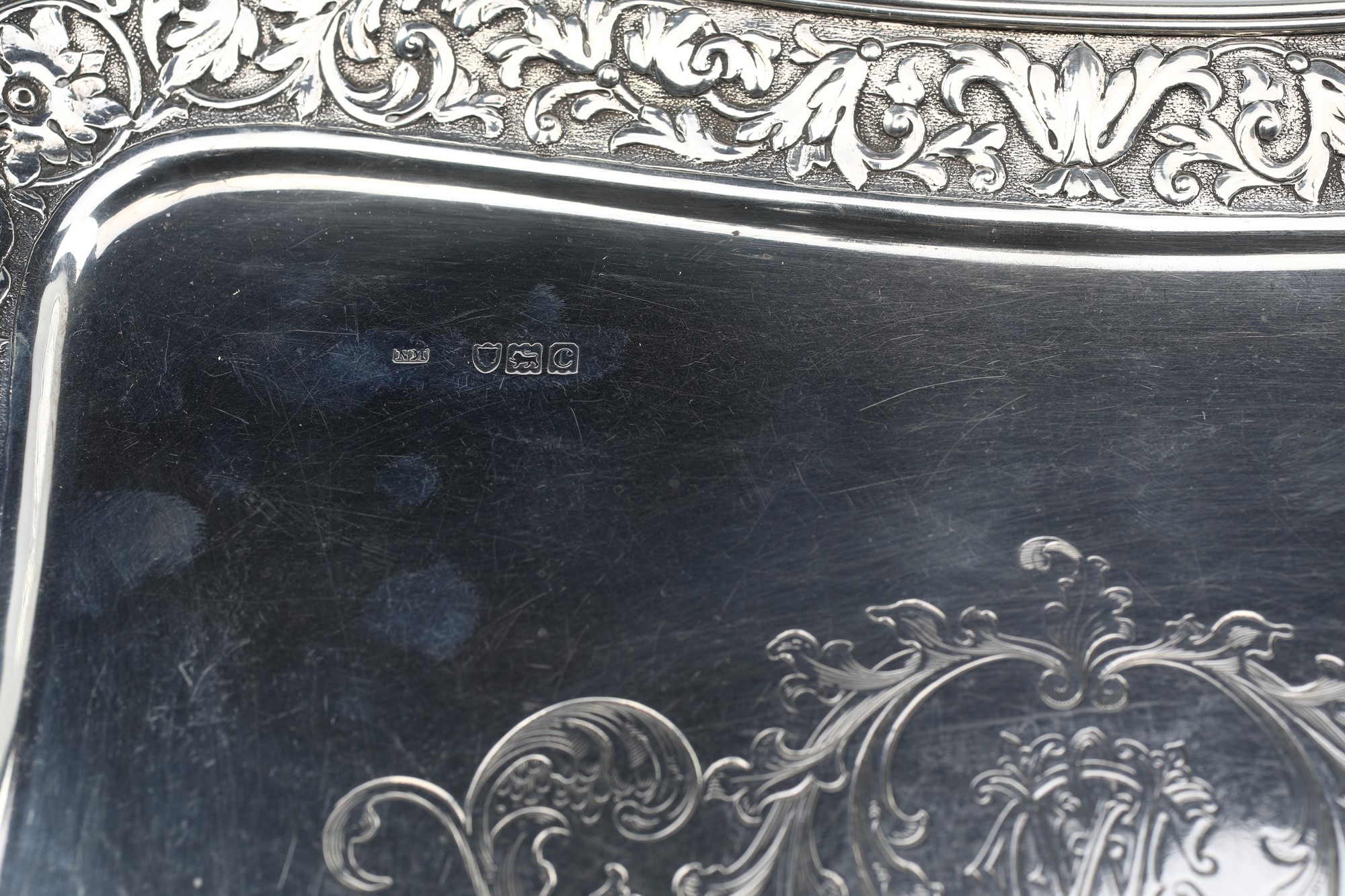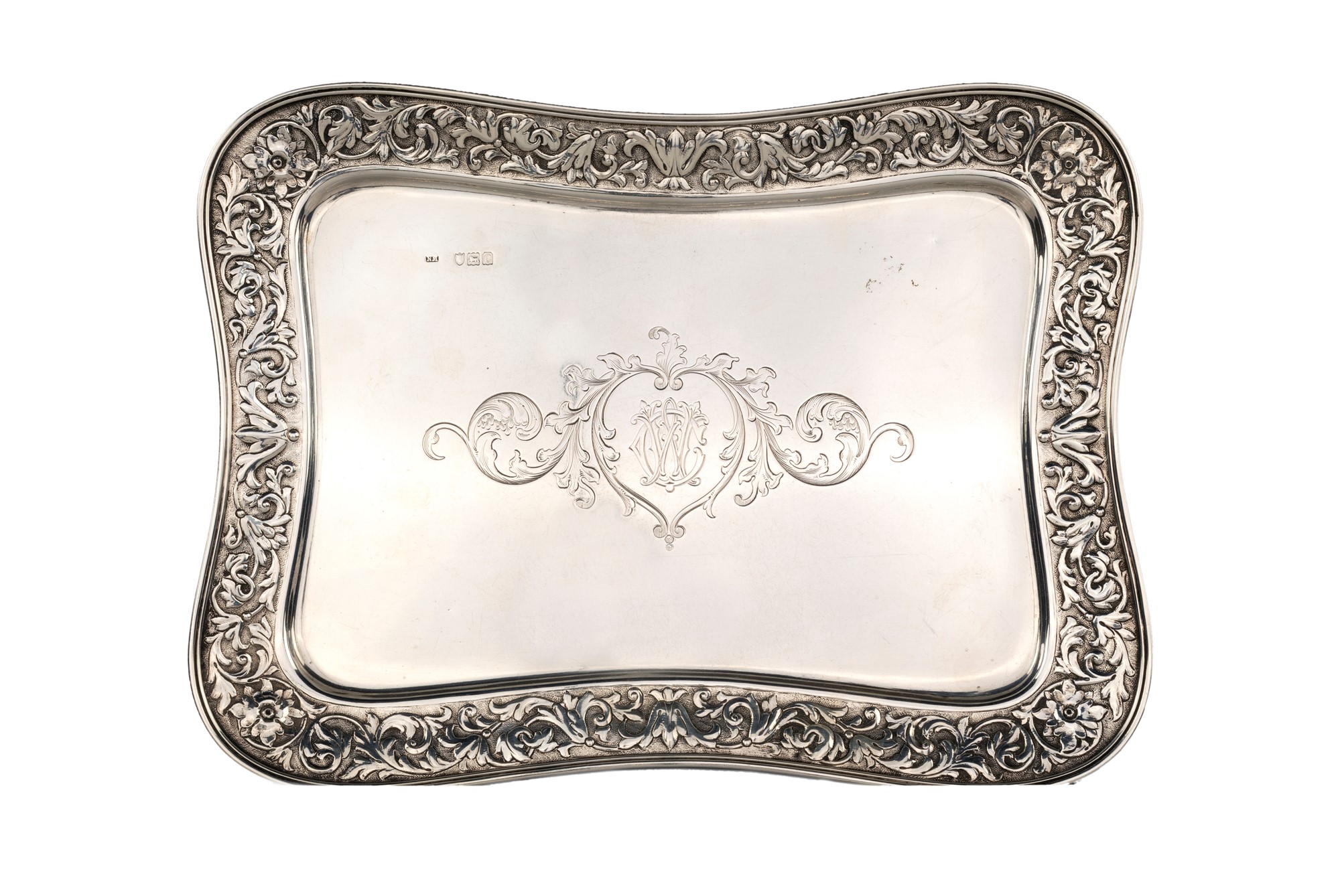 Vassoio in argento 925/1000, Londra 1898, argentiere Norman Marshall - di forma rettangolare lievemente sagomata, centrato da monogramma inciso racchiuso in un cartiglio definito da girali; tesa percorsa da volute vegetali e fiori cesellati. - cm 28x21 - gr. 516