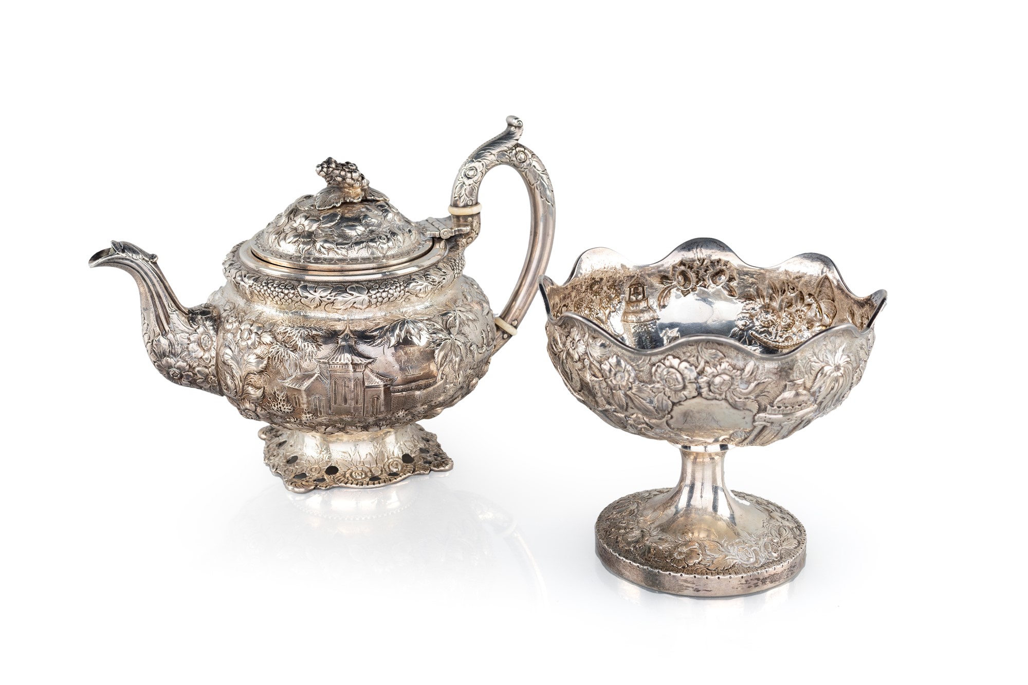 Teiera e coppa in argento sterling, Stati Uniti, Baltimora, Samuel Kirk & Son (1861 - 1868) - caratterizzate da chinoiséries sbalzate circondate da fitta ornamentazione a motivi naturalistici e farfalle. - altezza cm 18,5x26x14 e cm 13,5x16 - peso complessivo gr. 1654