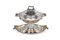 Grande zuppiera in argento, 1930 ca. - di forma circolare ornata da più ordini di bordure percorse da nervature; presa del coperchio e manici squadrati con mascheroni cesellati all'attaccatura. Bollo del Fascio (1930/45); poggiante su vassoio in sheffield con prese in forma di rilievo vegetale. - cm 36x29 - gr. 2.758