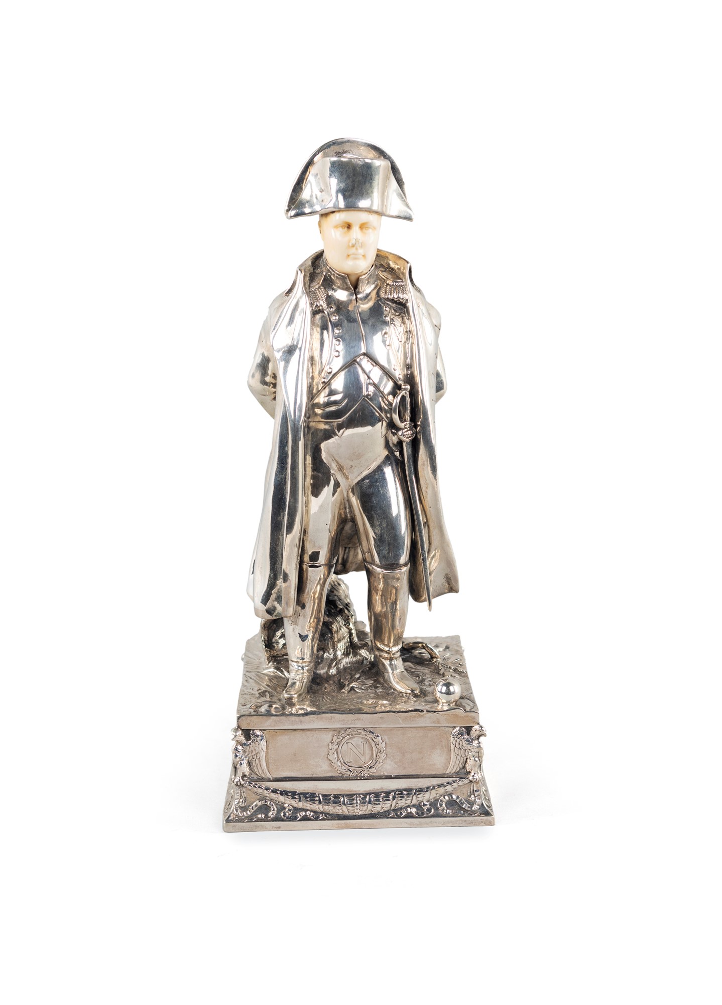 Scultura in argento, Olanda, fine del XIX secolo - raffigurante Napoleone Bonaparte ritratto atipico con entrambe le braccia rivolte dietro la schiena; testa animata in avorio col caratteristico "petit chapeau". - altezza cm 30 - peso complessivo gr. 1.064