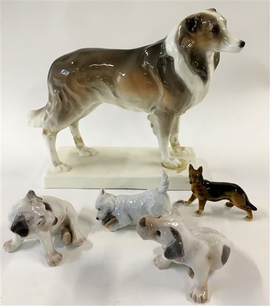 Manifattura danese. Lotto di cinque sculture in porcellana raffiguranti cani, m