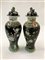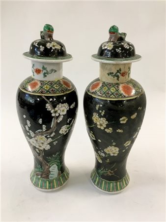 Coppia di vasi con coperchio in porcellana decorata in policromia su fondo nero
