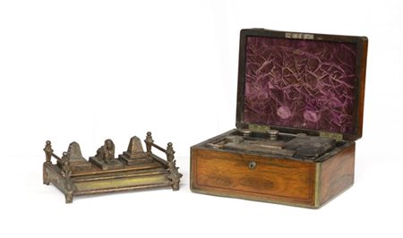 Lotto composto da un servizio da toelette da viaggio in vetro e argento in scatola di legno, ed un calamaio in metallo decorato con piramidi e sfinge (difetti e mancanze)