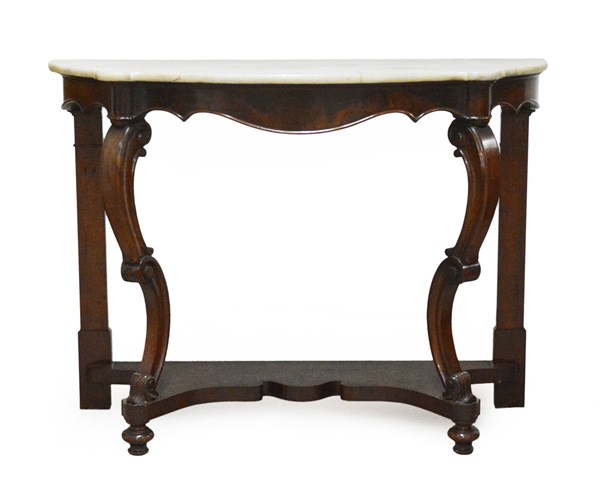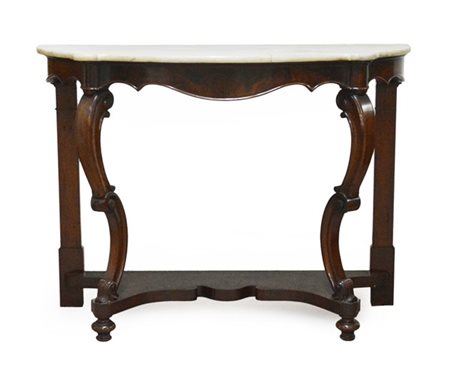 Console di forma sagomata in noce con fascia in radica di noce, gambe anteriori intagliate a riccioli e volute, posteriori a mezza colonna piatta, riunite da pianetto. Piano in marmo bianco, fine del secolo XIX (cm 132x99x53) (difetti e restauri)