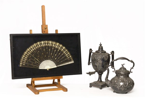 Lotto composto da due samovar, un cavalletto da pittore da tavolo ed un ventaglio in teca (difetti e mancanze)