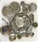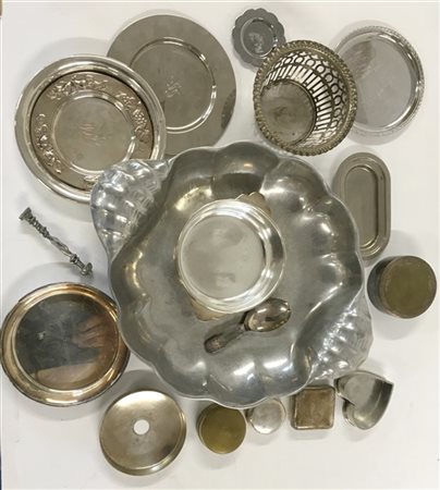Lotto composto da sei piattini, due ciotoline, un piccolo centrotavola traforato, un centrotavola più grande, quattro scatoline portapillole, un sigillo, un piccolo cucchiaio ed una scatolina a forma di cuore mancante del coperchio, in metallo argentato (difetti)