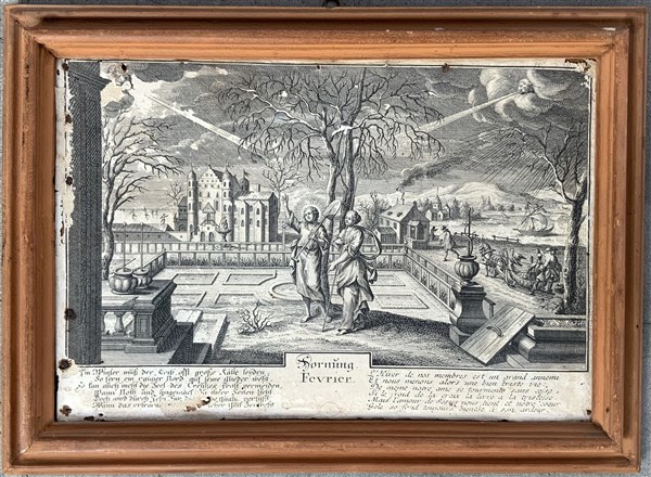 Incisione raffigurante il mese di febbraio con al centro scena religiosa (cm 20,5x29,5). In cornice
