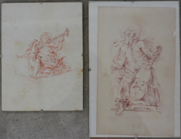Lotto composto da due disegni a sanguigna del secolo XX, copie da Girolamo Bedoli: uno raffigurante "Angelo che suona la tromba" (cm 24x17,5) e l'altro raffigurante "Santo musicante" (cm 28x17) (difetti)
