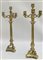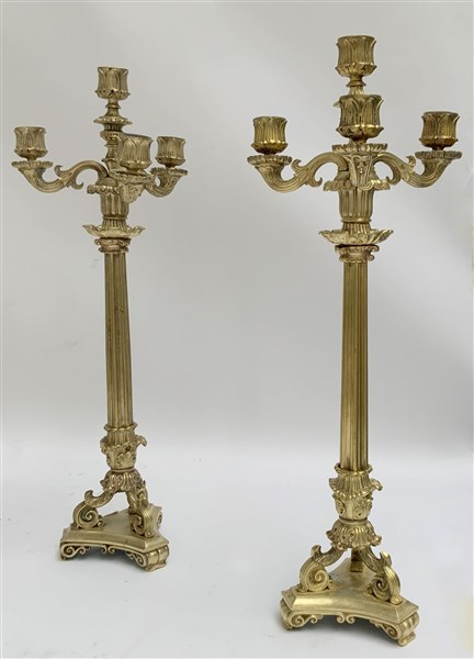 Coppia di candelabri in bronzo a tre fiamme, con fusto a colonna scanalata e de