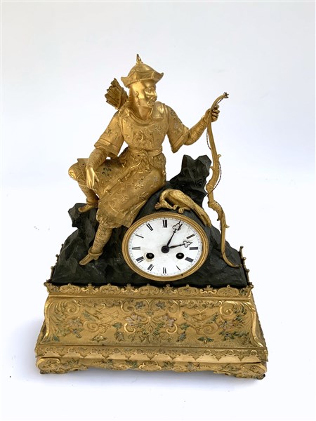 ANONIMO, Francia. Pendola da tavolo in bronzo dorato e cesellato sormontata da figura di guerriero orientale a tutto tondo. Epoca metà secolo XIX. Movimento a due treni con carica settimanale e suoneria delle ore e mezze con ruota partiore su campanello. Quadrante smaltato a numeri romani . Misura h. cm 40. (difetti, lancette sostituite).
