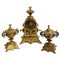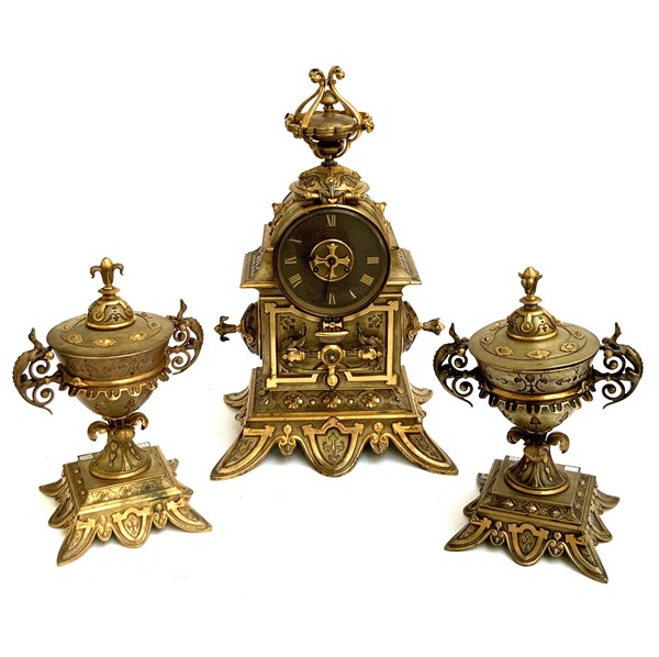 MUSY A TURIN. Trittico da camino Formato da una pendola e due vasi biansati in bronzo dorato e patinato. Epoca ultimo quarto secolo XIX. Movimento settimanale con suoneria delle ore e delle mezze su campanello con sistema a ruota partiore. Quadrante patinato con indici in ottone applicati. (difetti e mancanze)