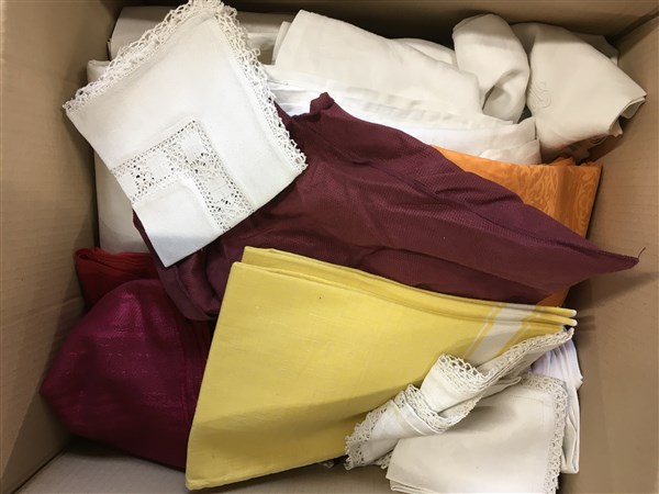 Cartone contenente numerosi tessuti in cotone, lenzuola, tovaglie, trovaglini e