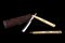 A leather case containing two bone and steel razors. Each blade with engraved Masonic symbols. Case with inscription "JOHN BARBER'S SUPERIOR RAZORS"