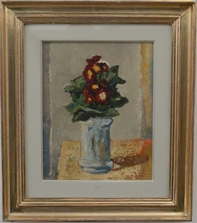 "Margheritine" olio su tavola (cm 39x24) Firmato in basso a destra. Al retro: cartiglio e timbri della Galleria d'Arte Ponte Rosso, Milano. In cornice