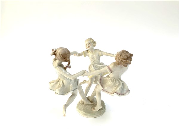 Manifattura tedesca, gruppo in porcellana policroma raffigurante tre ragazze che fanno il girotondo (h cm 21). (lievi difetti)