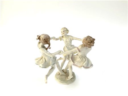 Manifattura tedesca, gruppo in porcellana policroma raffigurante tre ragazze che fanno il girotondo (h cm 21) (lievi difetti)