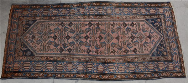 Decoro Herati su fondo rosa. Bordura a meandro su fondo azzurro. (cm 188x91) (difetti, rapature e vecchi restauri)