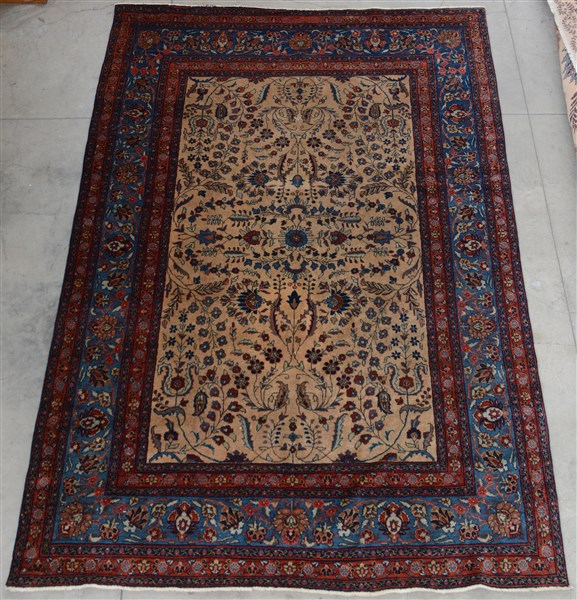 Decoro floreale su campo color cammello. Bordura principale Herati su fondo azzurro. (cm 274x181) (difetti)
