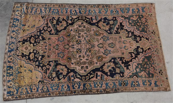 Decoro con grande medaglione con puntali rosa su fondo blu notte. Bordura a meandro su fondo azzurro. (cm 153x103) (difetti)