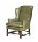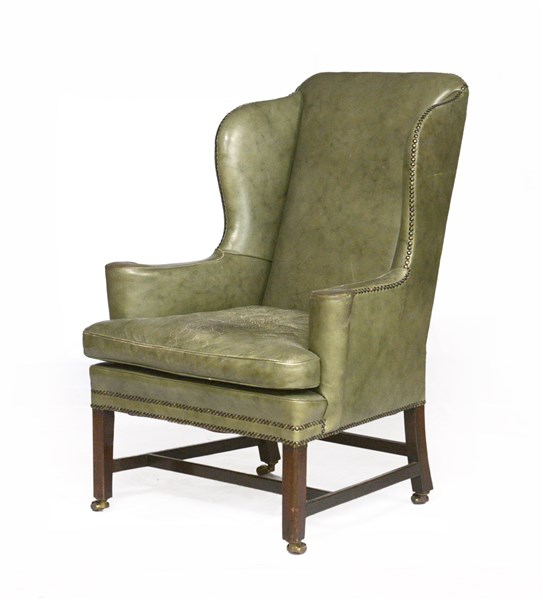 Poltrona bergere rivestita in pelle verde borchiata, gambe e traverse dritte, piedi muniti di rotelle. Inghilterra secolo XX (difetti)