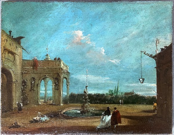 Scuola veneta del secolo XIX "Capriccio architettonico con figure" olio su tela