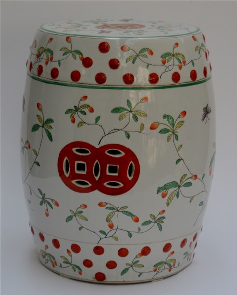 Sgabello in porcellana bianca decorato in policromia a motivo floreale con farf