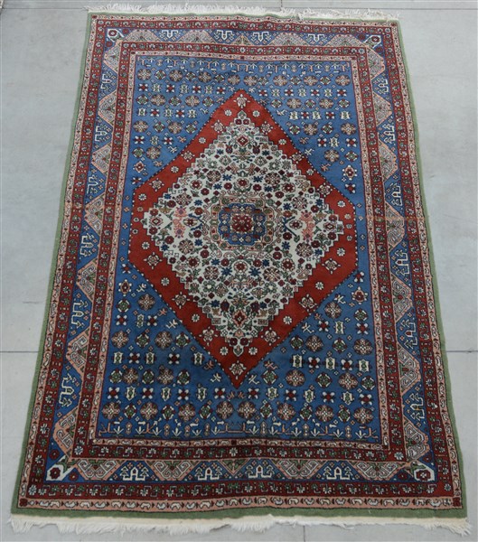 Annodato a lana a mano su cotone. Decoro con medaglione romboidale a fondo bianco cosparso di rami fioriti su campo color mattone. Angolari a fondo azzurro. (cm 281x181) (difetti)