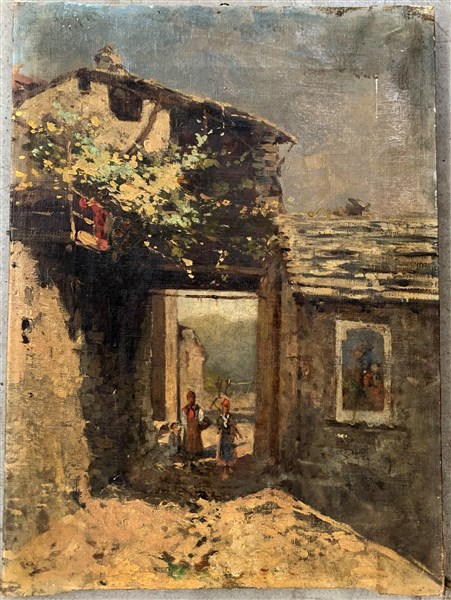 Eugenio Gignous "Paesaggio con case e figure" olio su tela (cm 52x38.5) Tracce d